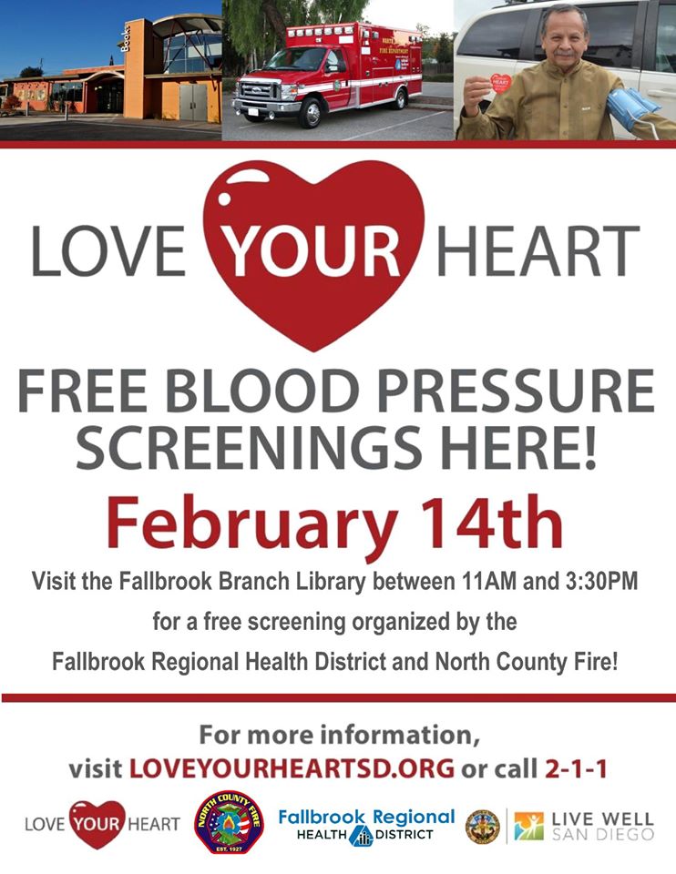 Join us and our community partner North County Fire for a free blood pressure screening!